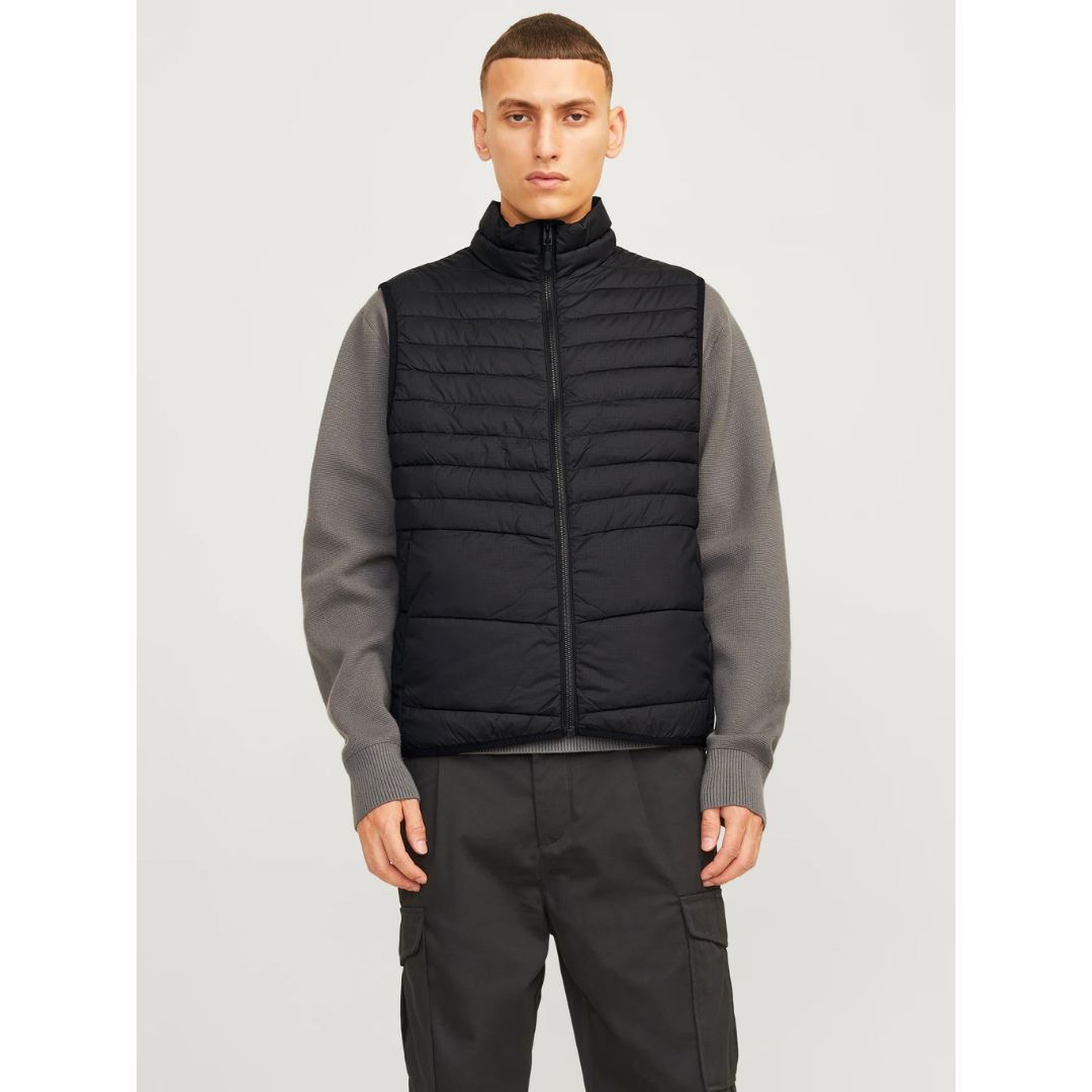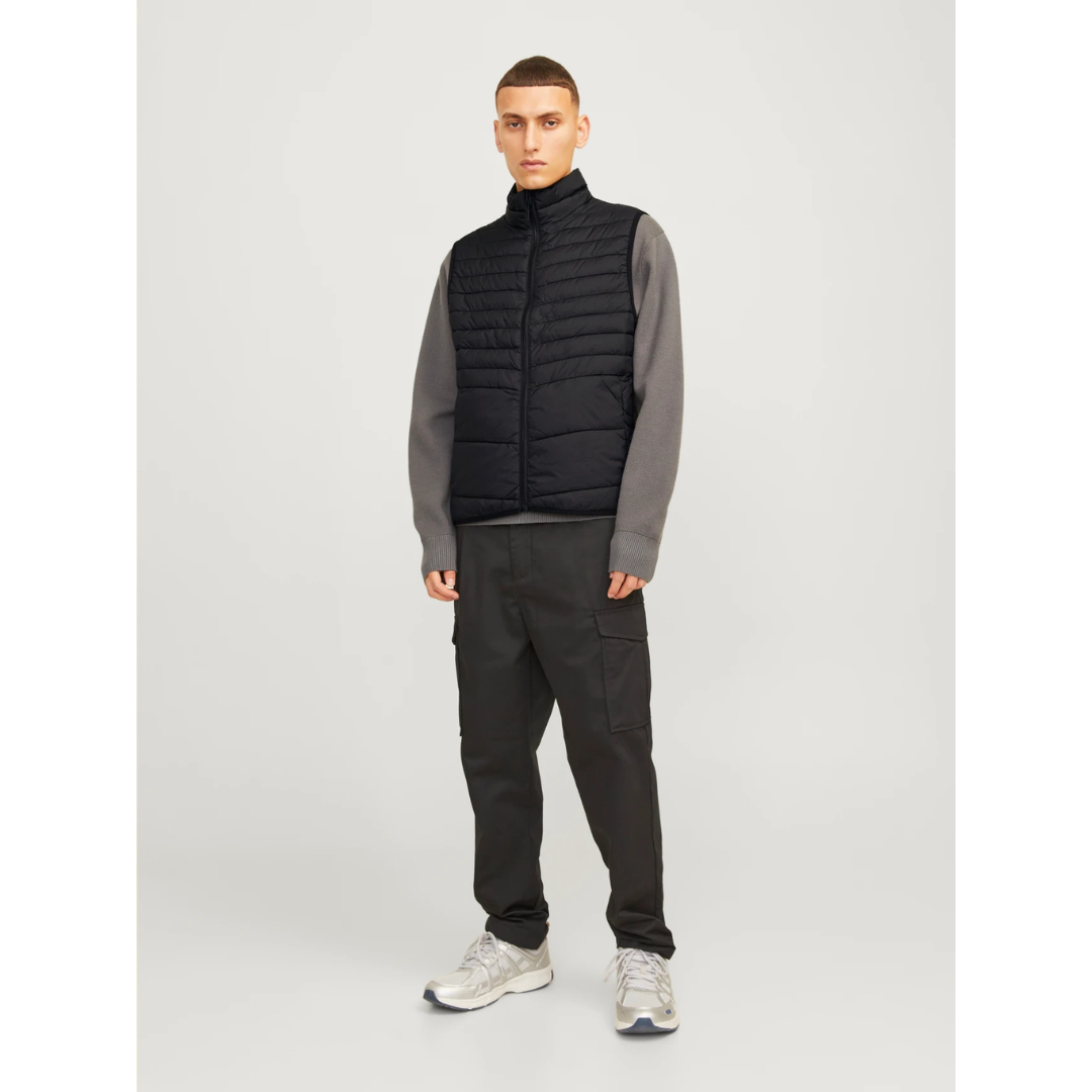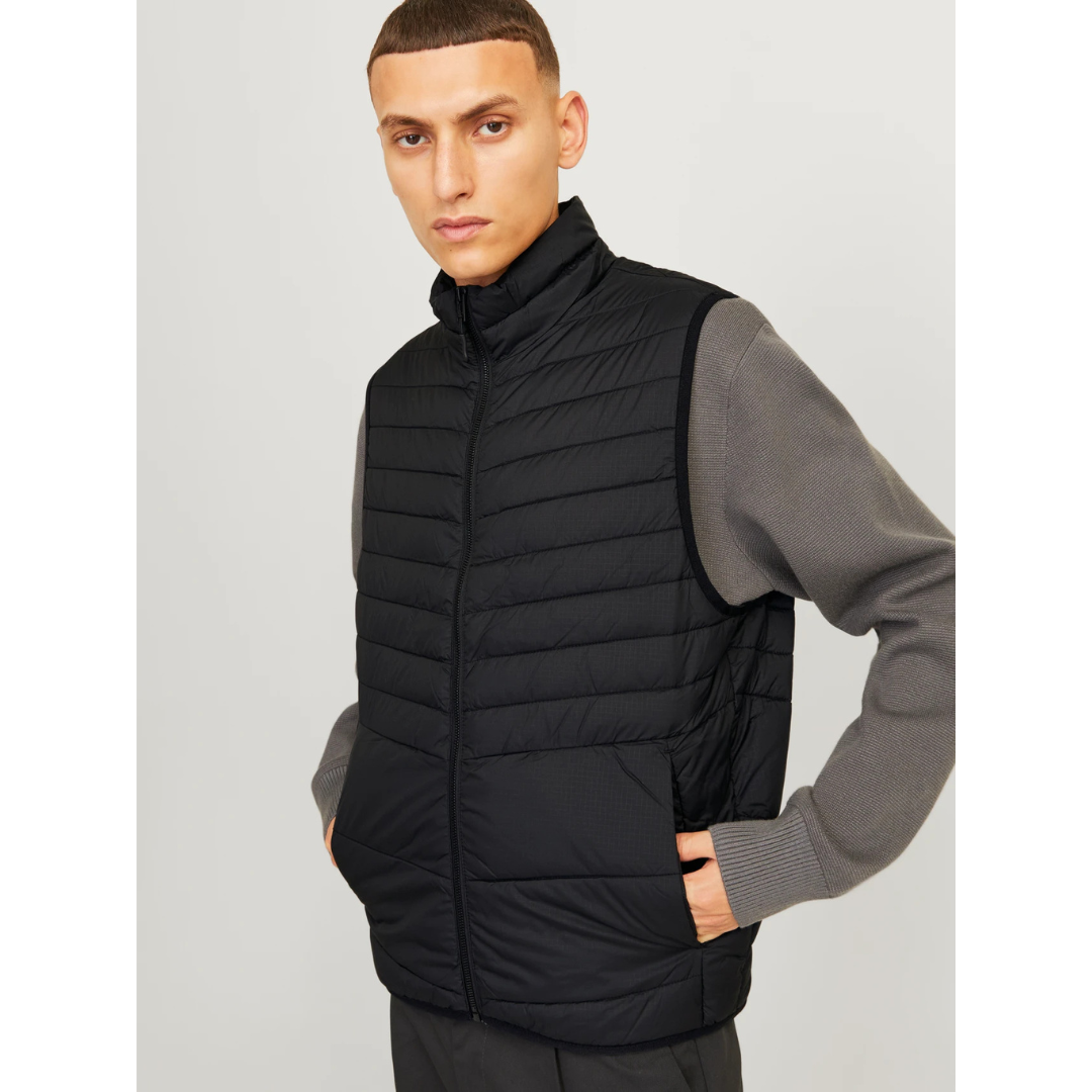 Crni muški prsluk brenda Jack & Jones, model 12256987 JJESTATE, je idealan za ležeran i praktičan izgled. Ovaj puffer prsluk s visokim okovratnikom savršeno se uklapa sa majicom ili džemperom, zavisno od vremenskih uslova. Napravljen od složenog quilt materijala, pruža toplotu i udobnost zahvaljujući sintetičkom punjenju koje zadržava laganu težinu, ali nudi dovoljno topline. Ovaj duks je opremljen skrivenim bočnim zip džepom i praktičnim prednjim džepovima. Dodatna prednost je što se može spakovati u jedan od džepova, čineći ga savršenim za putovanja i lako prenošenje.