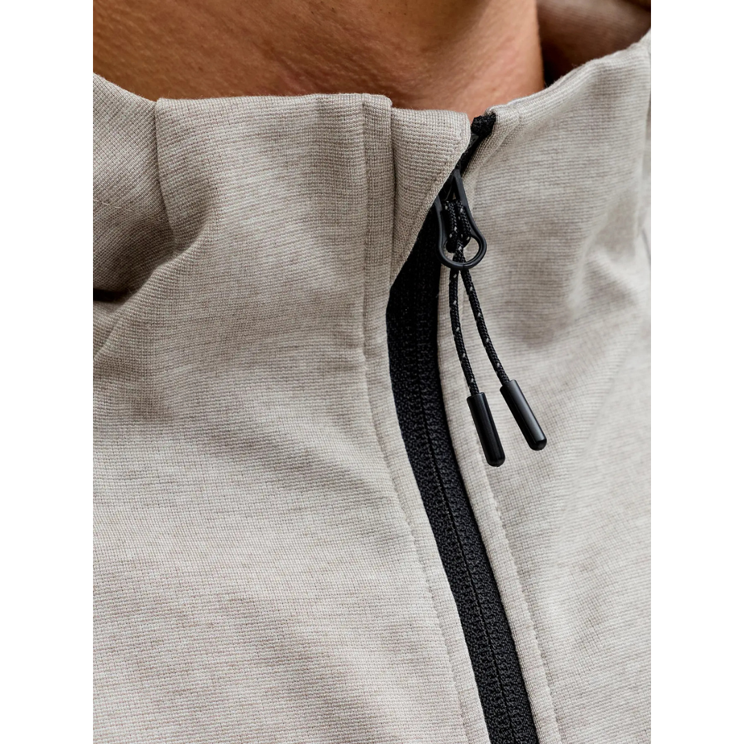 Duks poseduje rajsferšlus kopčanje celom dužinom, kapuljaču i bočne džepove sa rajsferšlusom za sigurnost i praktičnost. Materijal sadrži visok procenat recikliranog poliestera, što ga čini savremenim i odgovornijim izborom.